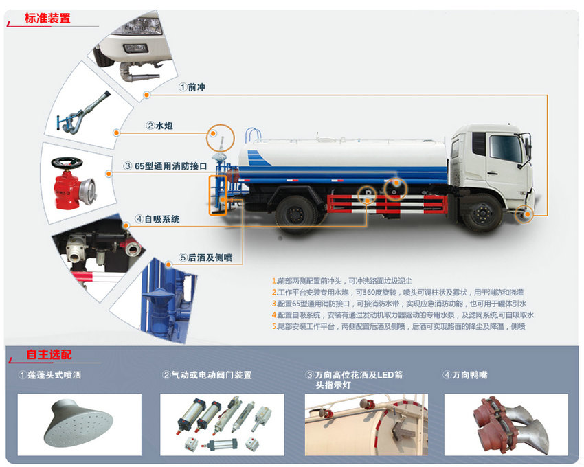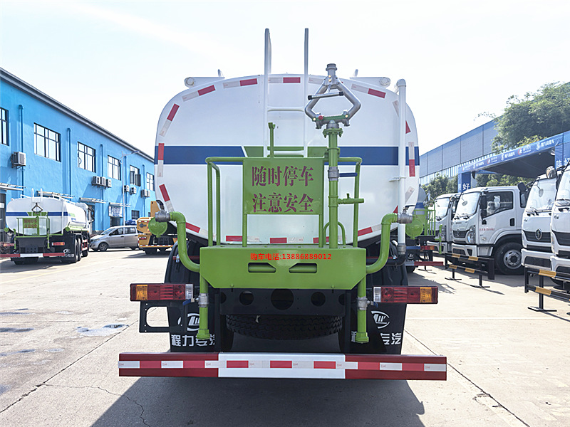 | 上裝配置:罐體采用國標Q235碳鋼,罐體厚度4mm,前后封頭5MM加厚型,罐體實際容積15噸(15方),《我們這里還有更大的,為您導航:東風華神F5灑水車》。產品質量成熟可靠,設計先進合理,比同類灑水泵壓力大、吸程遠、使用壽命長,可泵進泵出。前沖、后灑、側噴,消防栓接口,帶后工作平臺及綠化高炮(可全方位旋轉,可連續調成直沖狀、大雨、小雨、毛毛雨),水位計,兩根等長輸水管,其余標配。 |