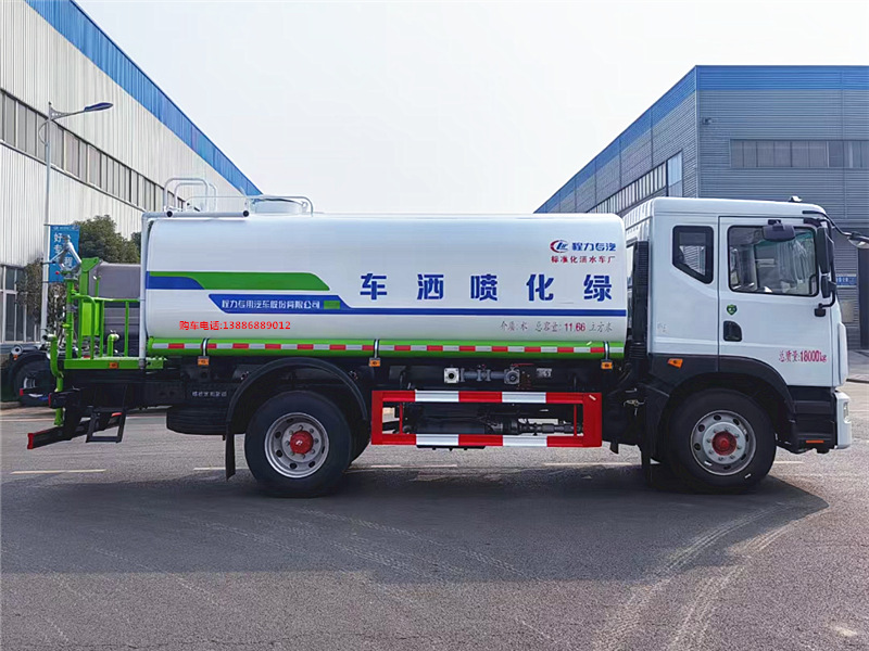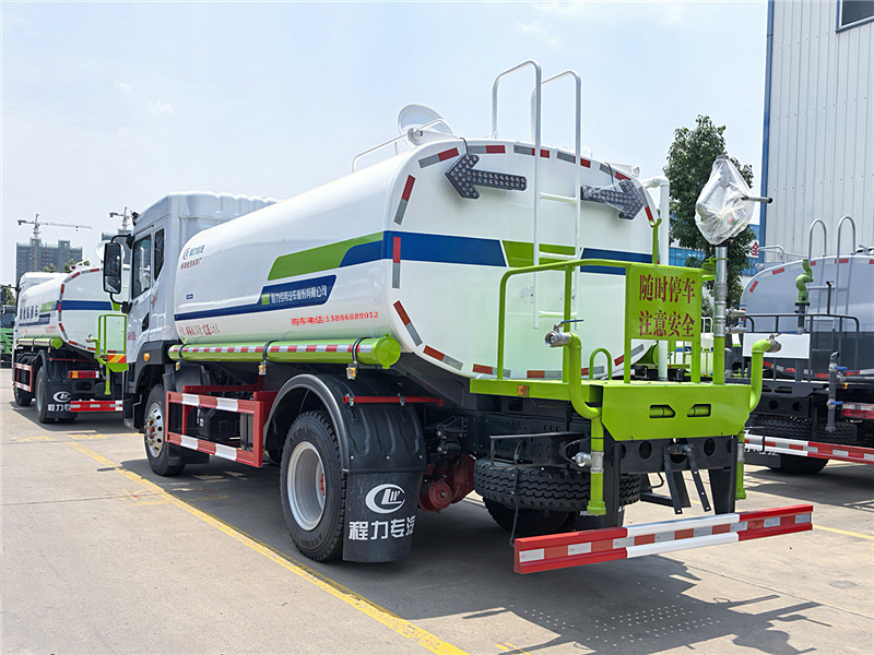 上裝配置:罐體采用國標Q235碳鋼板材制作,罐體厚度4mm,前后封頭5MM加厚型,罐體容積14-15噸(14~15方),東風多利卡灑水車質量成熟可靠,設計先進合理,比同類灑水泵吸程遠、壓力大、使用壽命長,可泵進泵出。前沖、后灑、側噴,消防栓接口,帶后工作平臺及綠化灑水高炮(可全方位旋轉,可連續調成直沖狀、大雨、小雨、毛毛雨),水位計,兩根等長輸水管,其余標配。