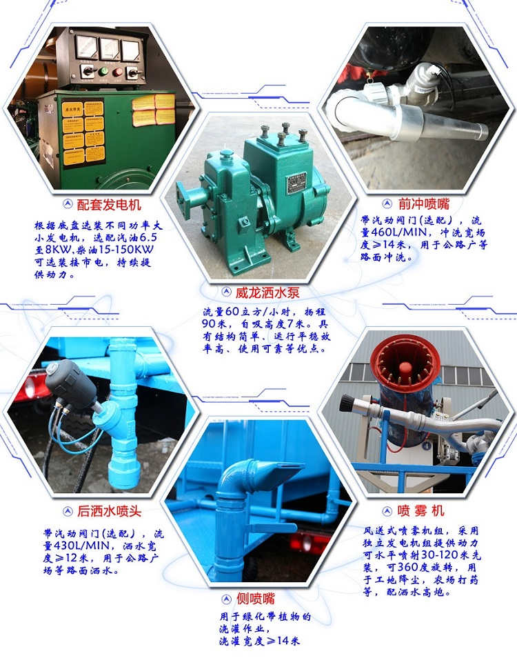 | 上裝配置:罐體采用國標Q235碳鋼板制作,可選用30米、40米中小型霧炮設備,罐體采用機器壓板一次性成型技術,采用先進旋邊機,罐體包罐機工藝保證了罐體制作的精度和美觀。罐體厚度4mm,前后封頭5MM加厚型,罐體實際容積5立方(5噸),全國獨有烤漆工藝,多層底漆、防腐除銹,面漆噴涂。 功能齊全,配備前沖、后灑、側噴、綠化高炮,采用優質水泵,合理設計水路管道,氣控取力器,作業能力強;采用汽油或柴油發電機組,霧炮噴灑距離選裝30-40米射程,運用范圍廣。 |